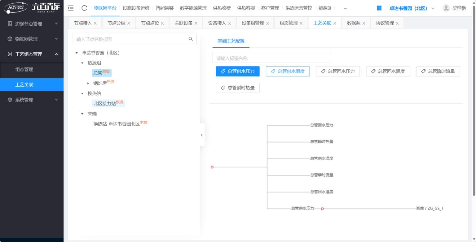 工艺组态管理:工艺组态(即WEB组态)即通过拖拽设备组件+连接节点的方式在画布上直观、友好的向用户展示工艺流;以工艺流为基础,通过设备和点位关系的自动绑定+点位和设备的属性配置等主动绑定相结合的方式实现数据流,达到更贴近现实的工艺分析目标;同时也为后续控制流的实现、精细化运营等提供支撑。